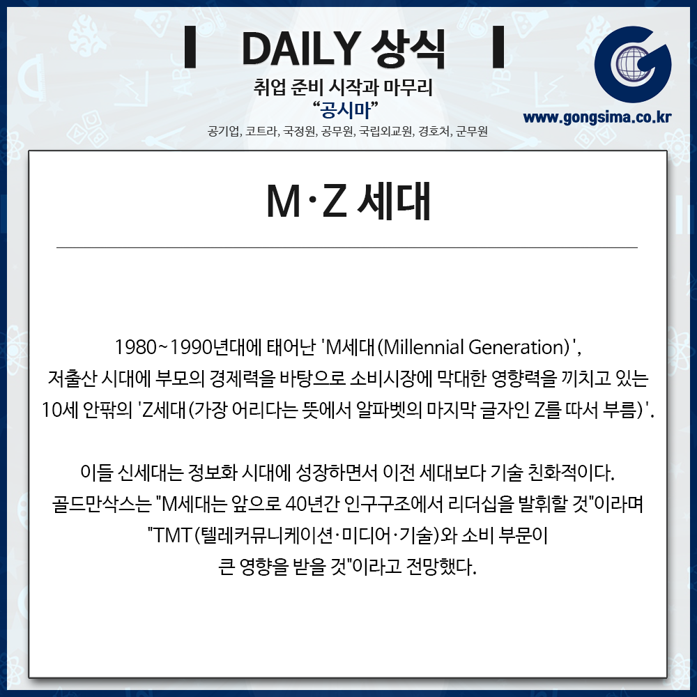 천년의라는 의미를 함의하고있는 밀레니얼과 알파벳 X Y 다음 순서인 Z를 이용하여 MZ세대라고하더라고요.